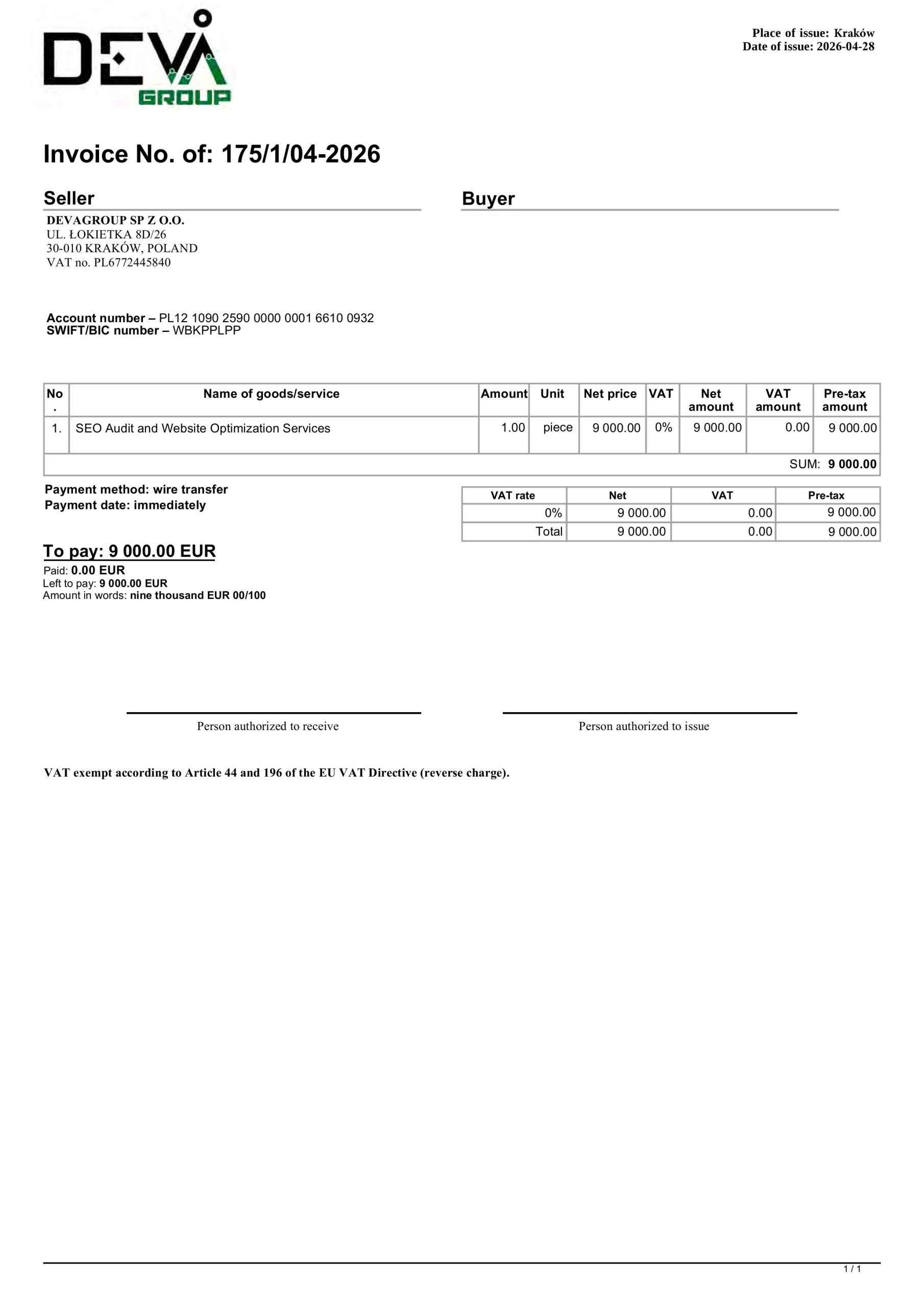 Bankgiro: PL56 1090 1766 0000 0001 6658 8795, PL12 1090 2590 0000 0001 6610 0932