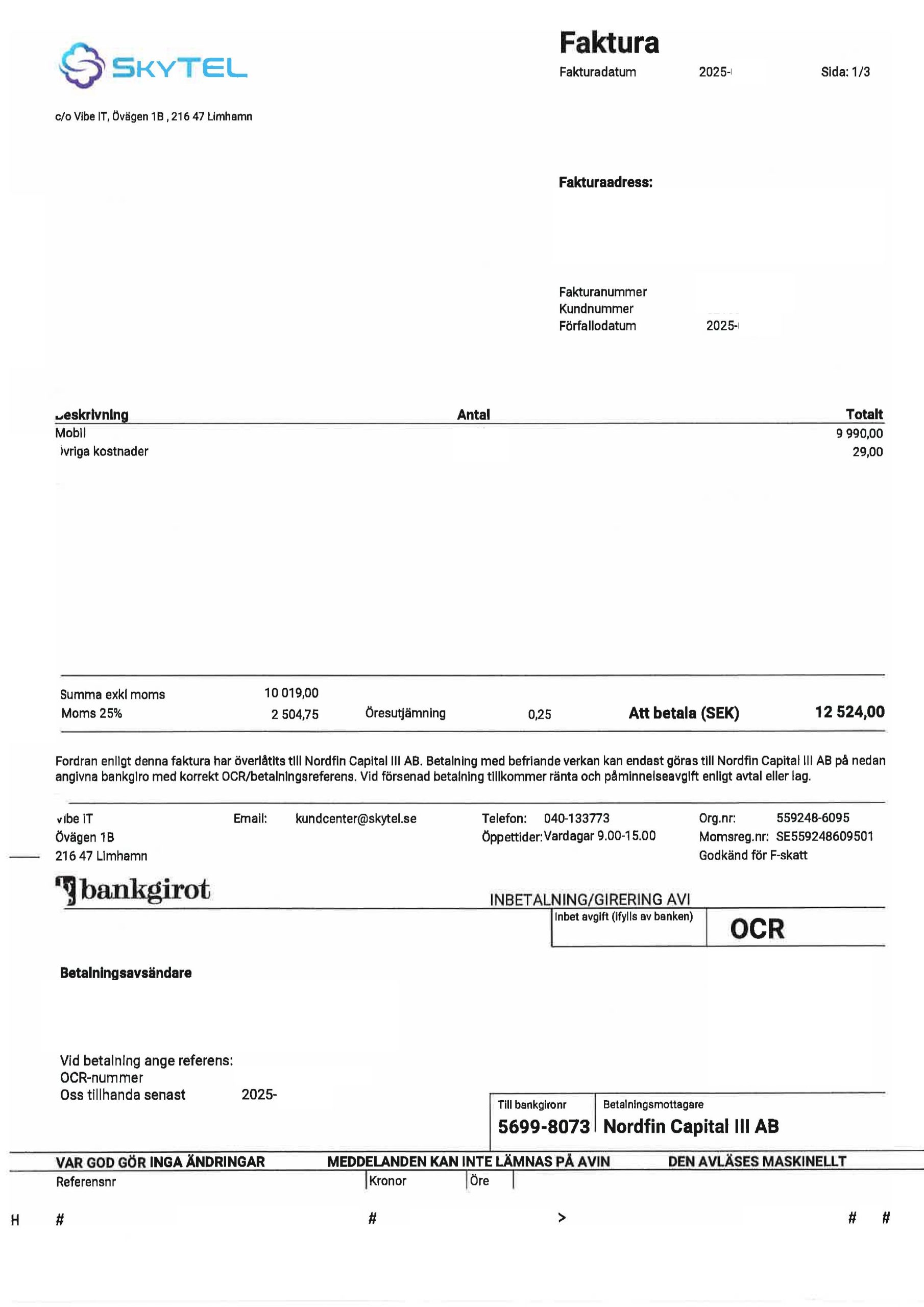 - Betalningsmottagare är Nordfin Capital III AB (bankgiro 5961-6102)